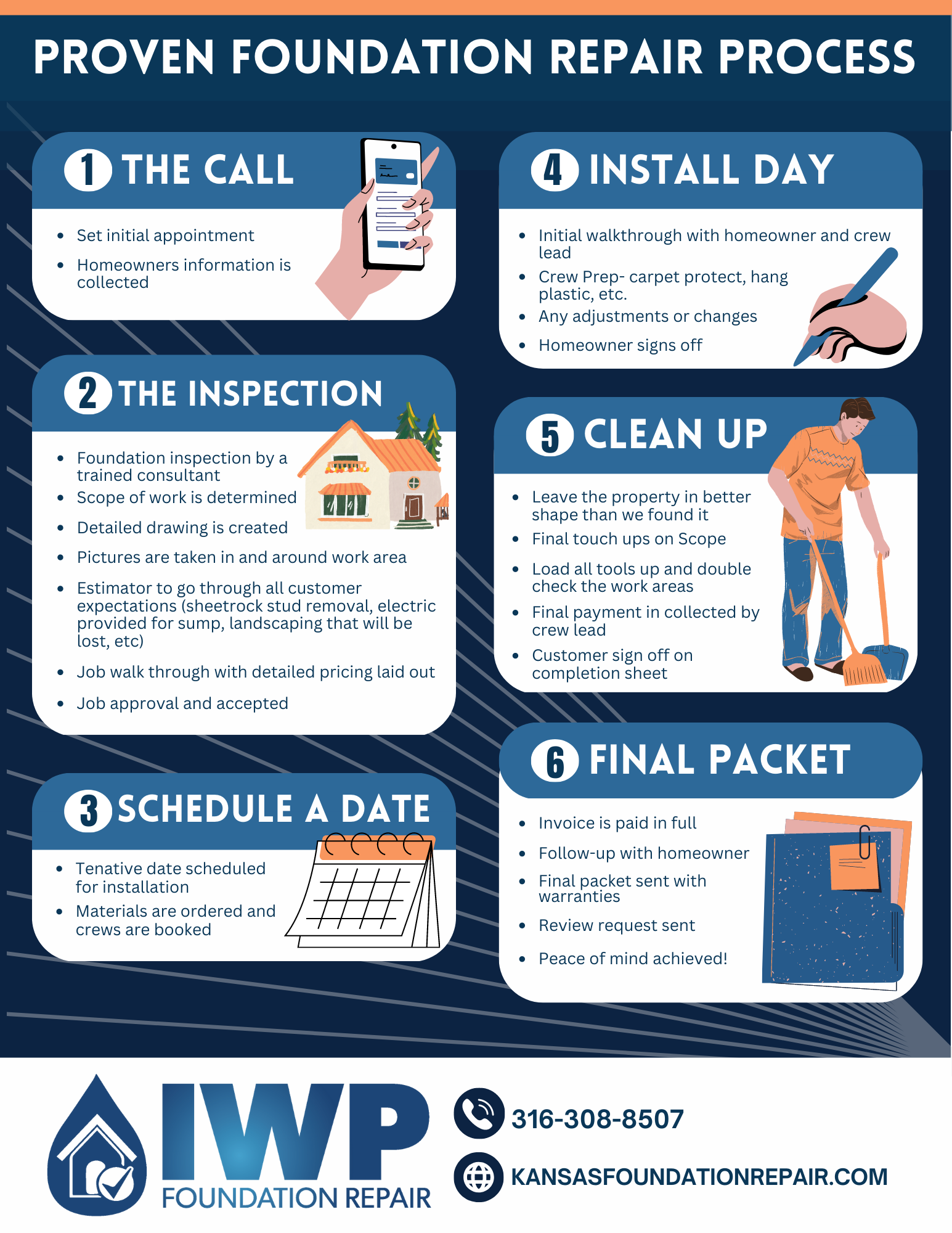 At IWP Foundation Repair, we work hard to make your repair process as painless as possible. With a thorough FREE EVALUATION and consult, we want to ensure you understand the repairs needed, why they're needed, and what options are available.